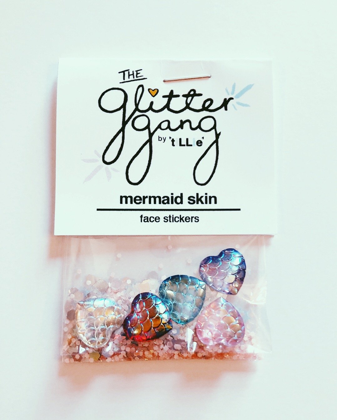 the glitter gang mermaid skin pack comes with 5 mermaid skin facial stickers + a separate pack of loose glitter!